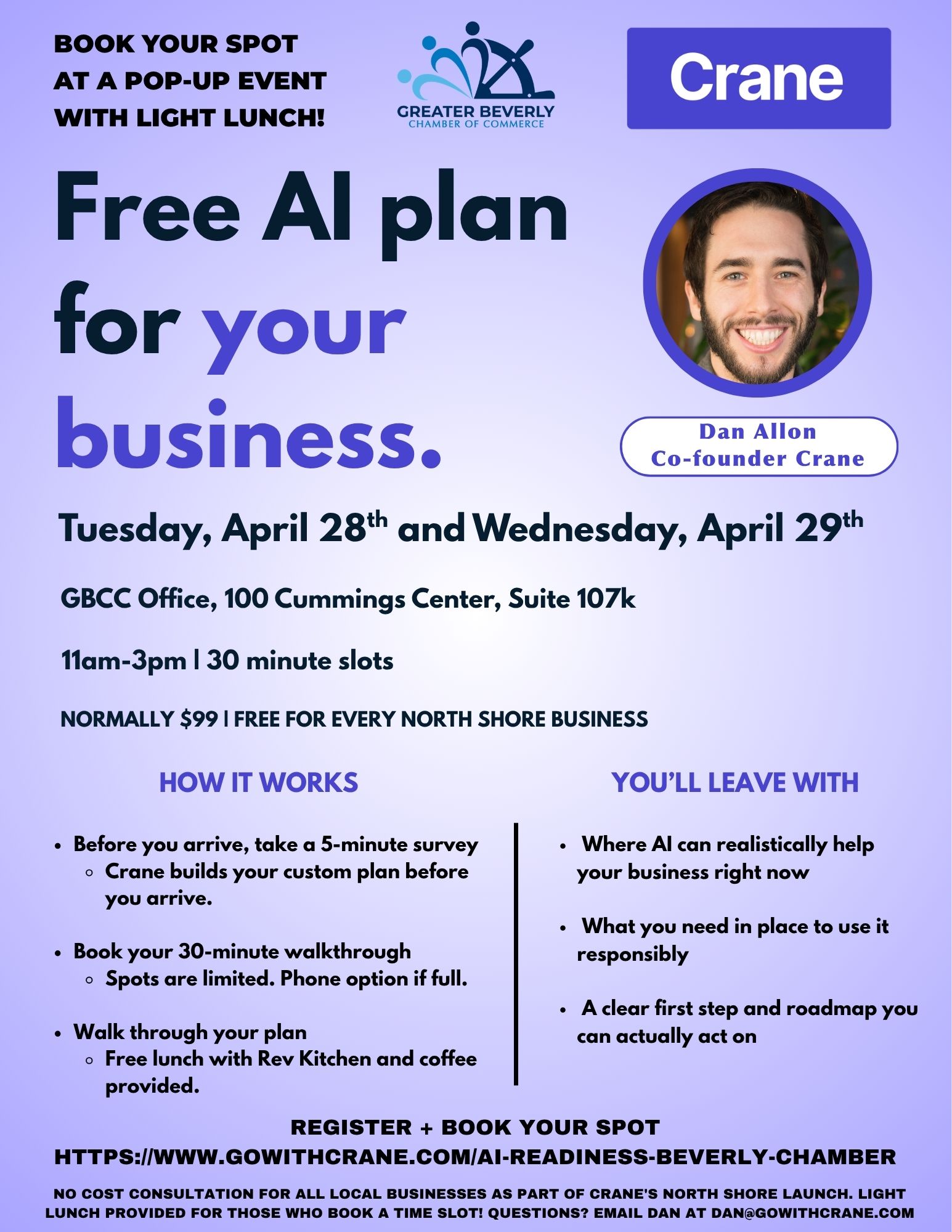 Dan Allon, a Beverly resident and new Chamber member, is popping up at the Chamber with his company Crane to sit down one-on-one with North Shore business owners. Instead of generic advice, you'll get a custom analysis and plan based on how your business actually works.
